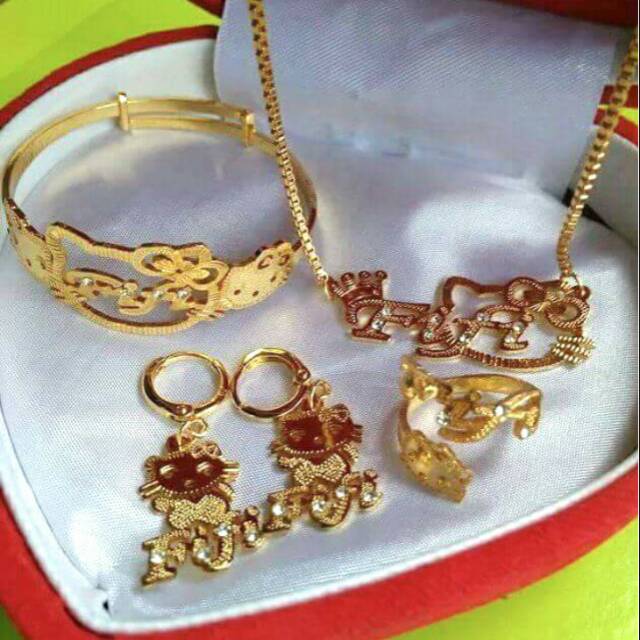 Perhiasan Ukir Nama Lapis Emas Satu Set Kalung Gelang Anting Cincin Motif Hello Kitty | Shopee Indonesia