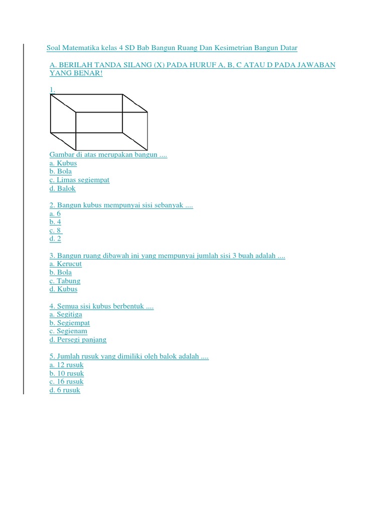 Soal Matematika Kelas 4 SD Bab Bangun Ruang Dan Kesimetrian Bangun Datar