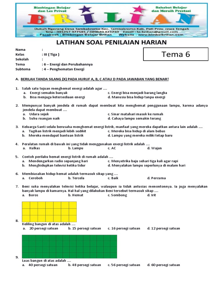 Soal Tematik Kelas 3 SD Tema 6 Subtema 4 Penghematan Energi dan Kunci Jawaban - www.bimbelbrilian.com .pdf