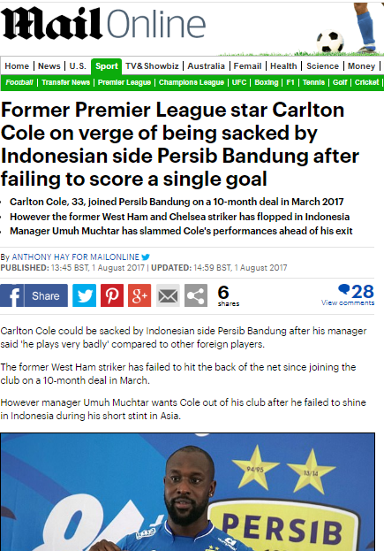 Media Inggris Soroti Pencoretan Carlton Cole oleh Persib Bandung - Bolalob.com