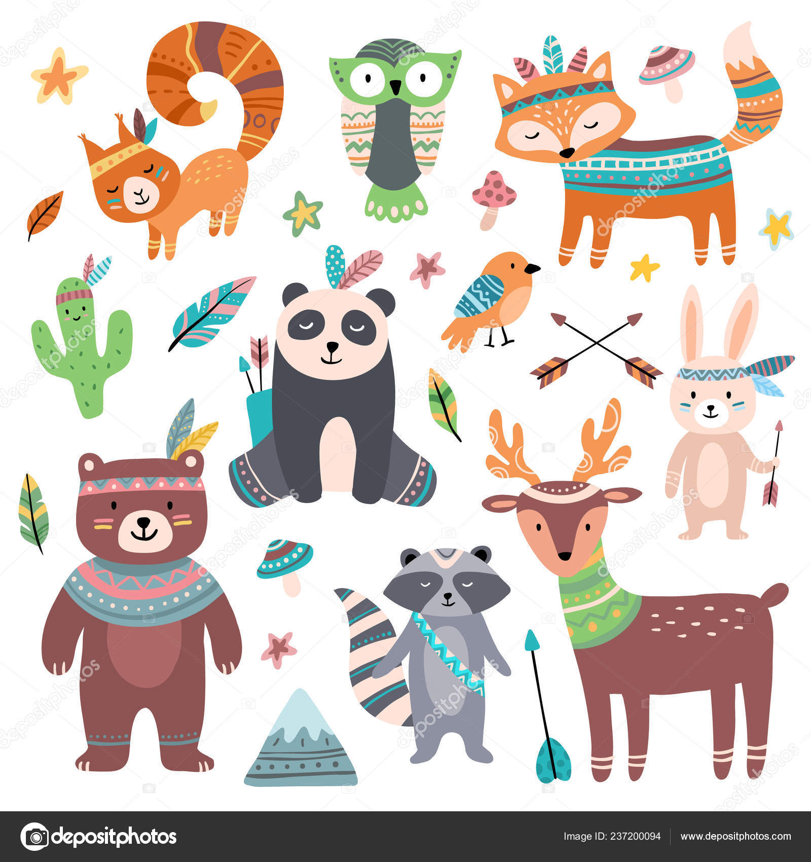 Hewan suku yang lucu. Kebun binatang hewan liar hutan, burung tribal bulu panah dan binatang liar set kartun terisolasi — Stok Vektor © tartila.stock.gmail.com #237200094