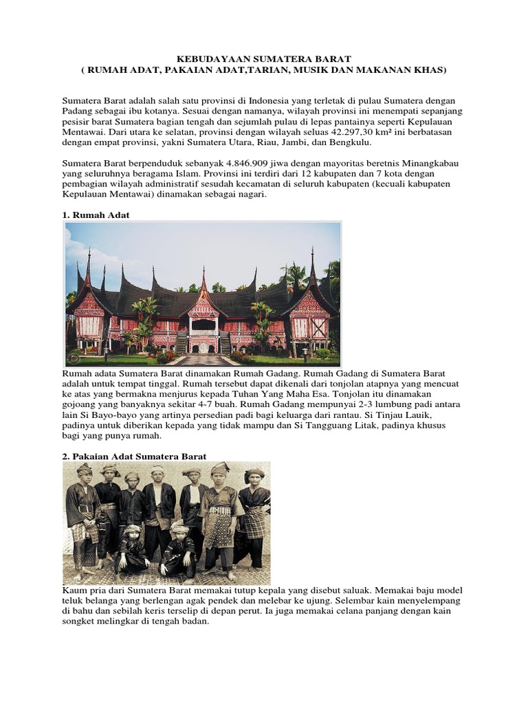 Kebudayaan Sumatera Barat Rumah Adat, Pakaian Adat,Tarian, Musik Dan Makanan Khas