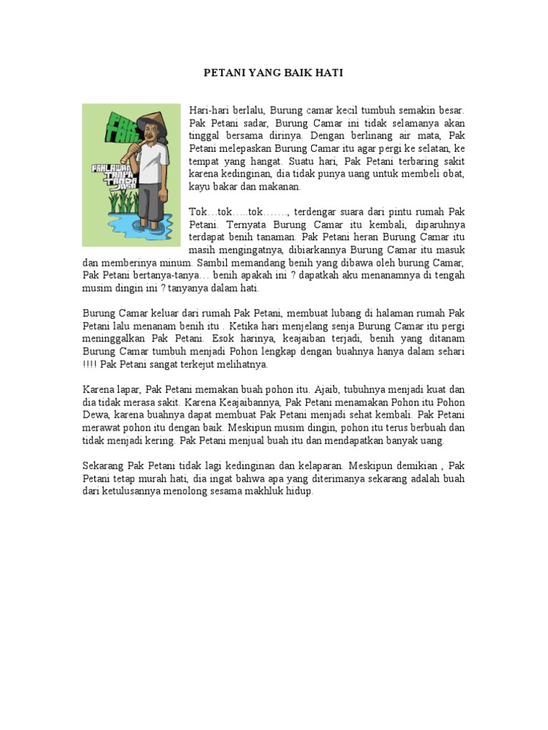 Petani yang Baik HatiDi suatu desa, hiduplah seorang petani yang sudah tua. Petani ini hidup - Brainly.co.id