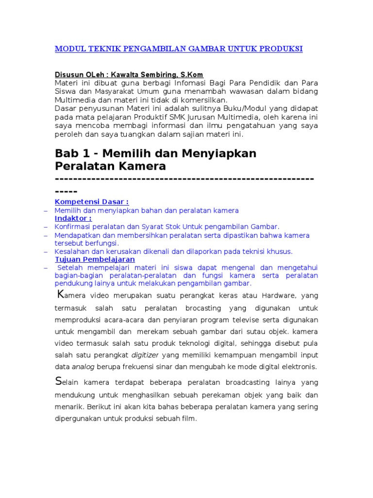 Bahan Ajar Kamera Modul Teknik Pengambilan Gambar Untuk Produksi