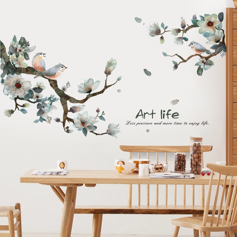 Ruang tamu TV latar belakang stiker yang dilukis dengan tangan bunga dan burung stiker dinding perekat diri dekorasi baru Cina klasik tinta lukisan stiker wallpaper | Shopee Indonesia