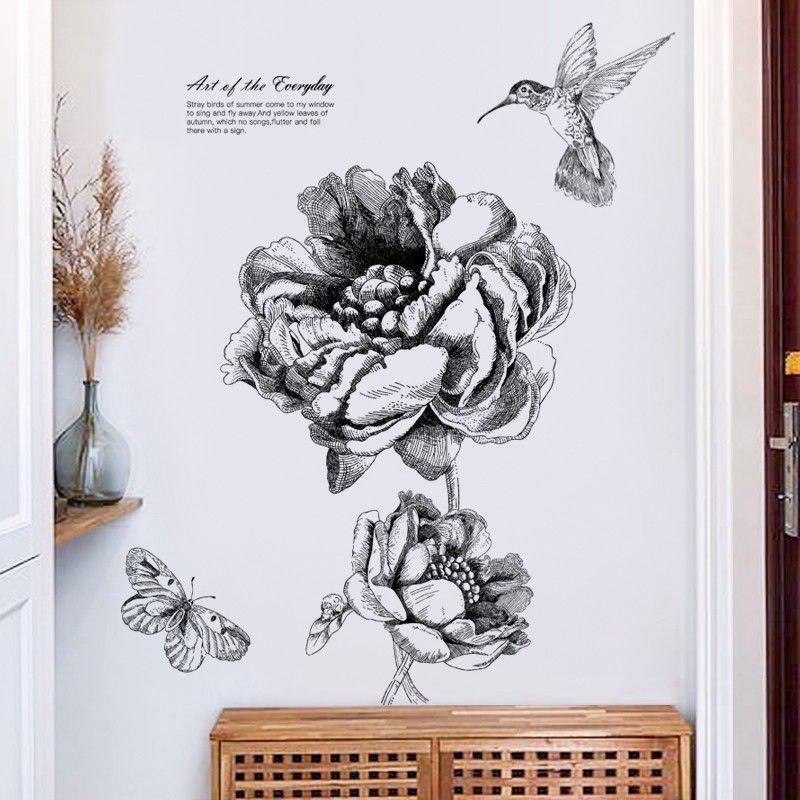 Modern Cina yang dilukis dengan tangan hitam dan putih bunga dan burung stiker dinding studio masuk dinding dekorasi seni stiker bunga perekat diri | Shopee Indonesia