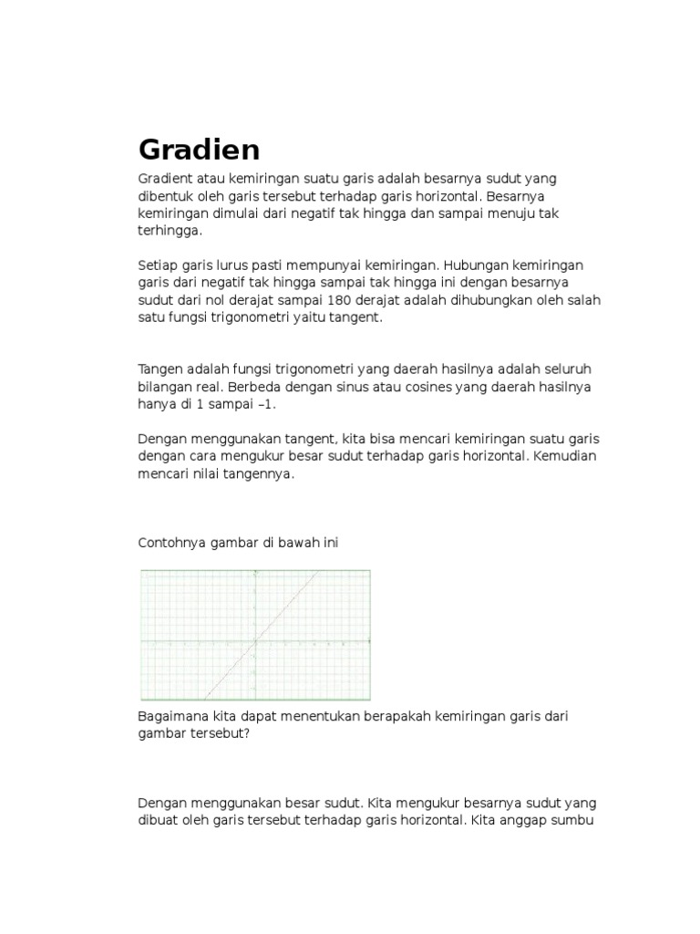 Gradient atau kemiringan suatu garis adalah besarnya sudut yang dibentuk oleh garis tersebut terhadap garis horizontal.doc