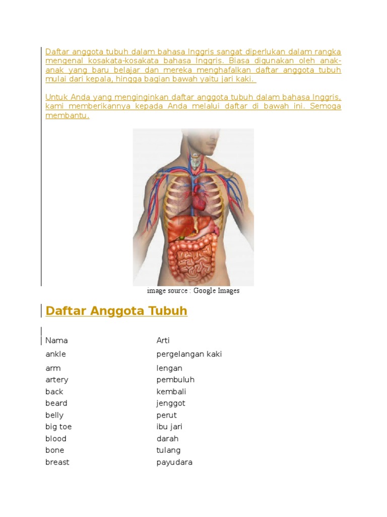 Bagian Bagian Tubuh Manusia Dalam Bahasa Inggris Dan Artinya - Berbagai Bagian Penting