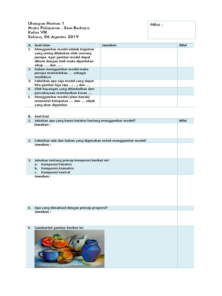 Ulangan Harian 1 Mata Pelajaran: Seni Budaya Kelas VIII Selasa, 06 Agustus 2019 Nilai
