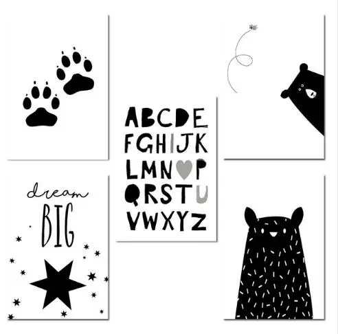 Nordic Lukisan Gambar Anak Dekorasi Kamar Hitam Putih Beruang Paw Wall Art Kanvas Lucu Poster Nursery Penawaran Alphabet Cetak|quote print|painting picturewall art canvas - AliExpress