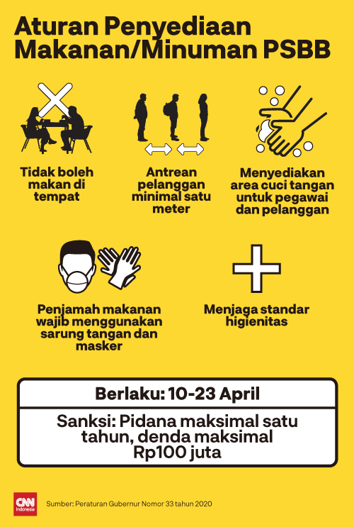 CNN Indonesia on Twitter: “Selama PSBB berlangsung, makan/minum di tempat dilarang. Antrean pelanggan juga harus diberi jarak minimal satu meter. Ketahui aturan lainnya selama PSBB di Jakarta berlangsung di sini: https://t.co/Rf3zuFtazY #CNNIndonesia