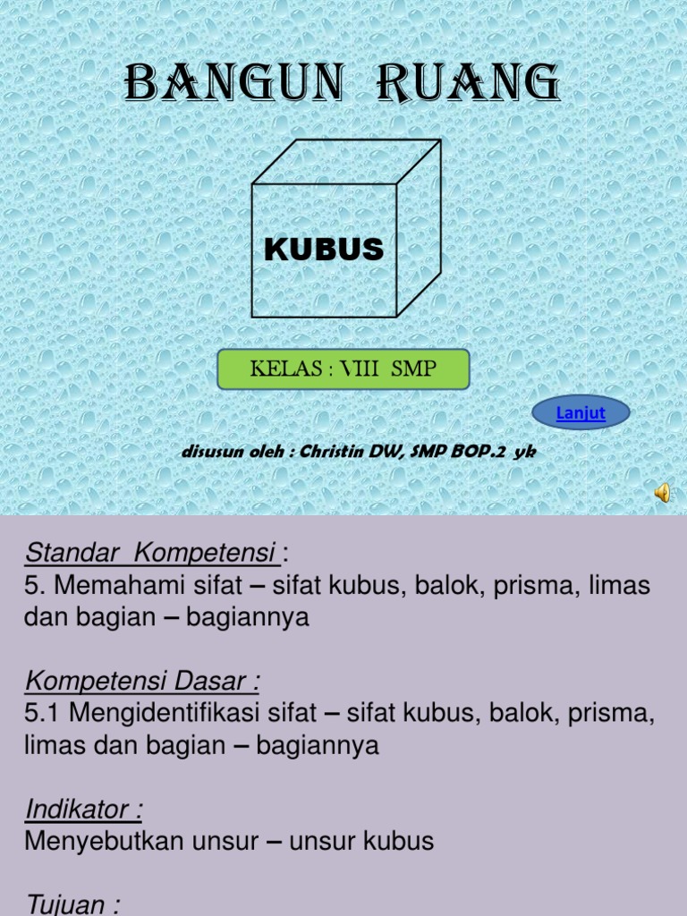 A. KUBUS Definisi Kubus adalah bangun ruang yang dibatasi enam sisi berbentuk persegi yang kongruen. - PDF Download Gratis