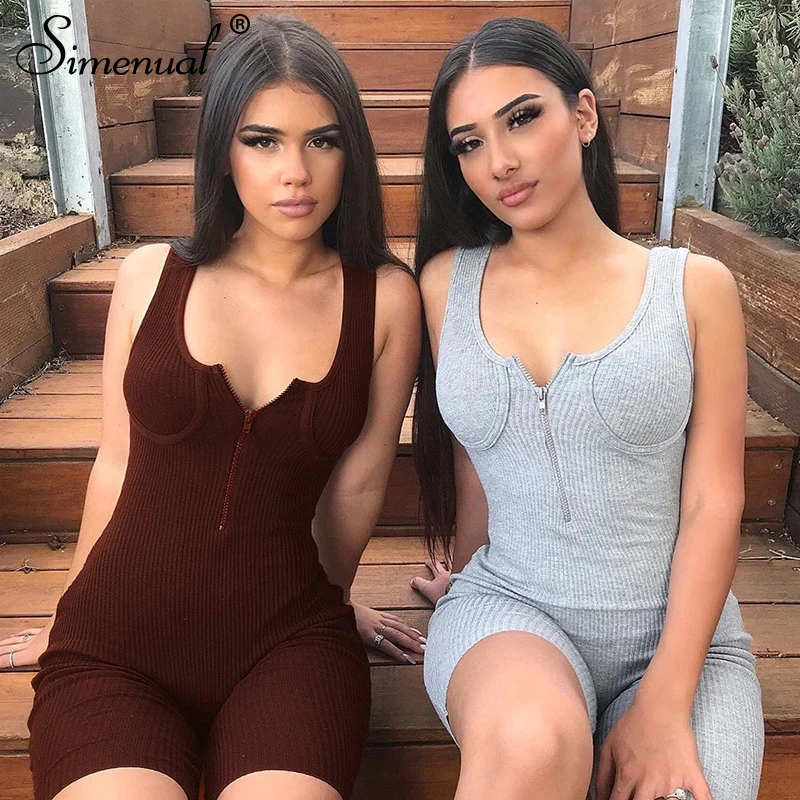 Simenual Ribeed Zipper Kasual Sporty Aktif Memakai Baju Monyet Wanita Tanpa Lengan Fashion Latihan Biker Celana Pendek Playsuits 2020 Active Wear| | - AliExpress