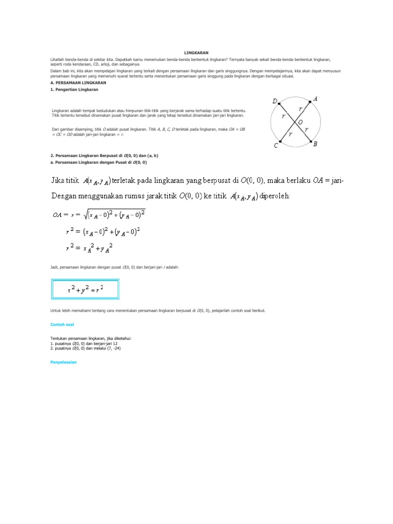 LINGKARAN - persamaan lingkaran jika diketahui: 1. pusatnya O(0, 0) dan berjari-jari 12; 2. pusatnya O(0, 0) dan melalui (7, –24). Penyelesaian 1. Lingkaran yang berpusat di O(0, - [PDF Document]