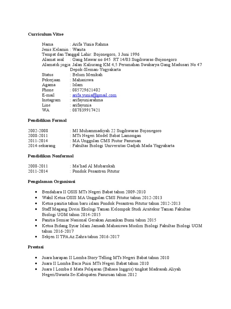 Contoh Daftar Riwayat Hidup Curriculum Vitae - Contoh Surat