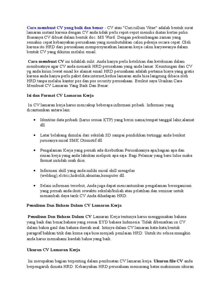Cara Membuat CV Yang Baik, CV Kerja, Contoh CV Lamaran