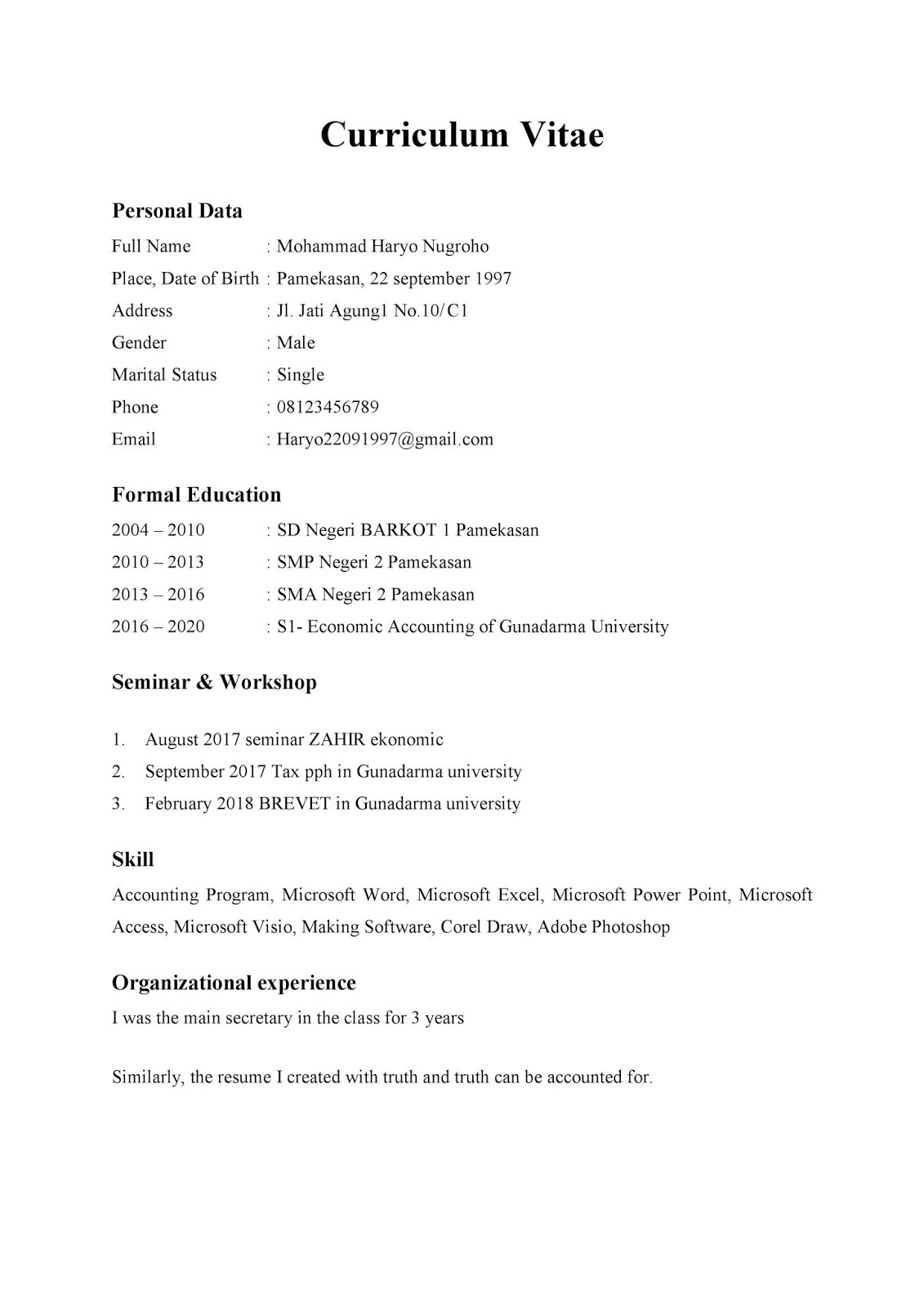 Contoh CV (Curriculum Vitae) untuk Fresh Graduate | Catatan Kecil Sang Fajar