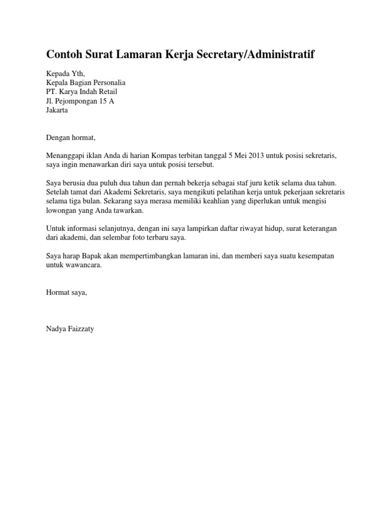Contoh Surat Lamaran Pekerjaan Untuk Administrasi Dan Perkantoran - Tanpa Koma