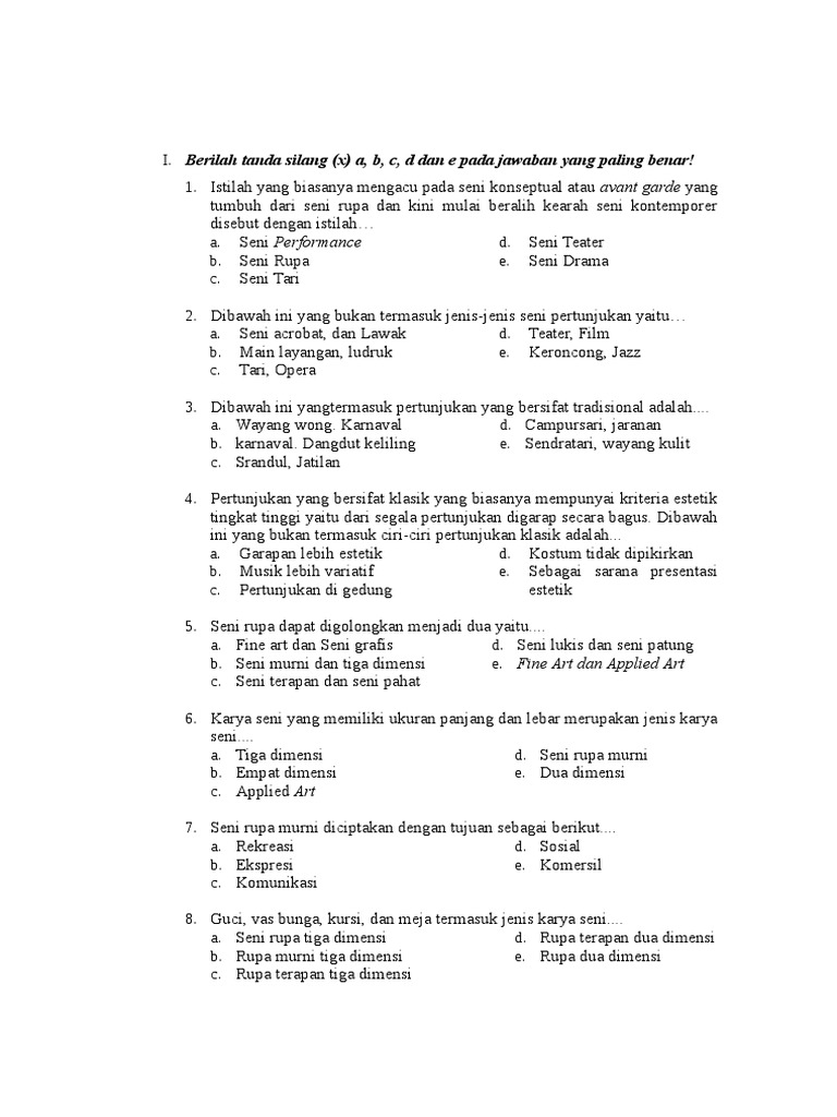 Soal Seni Budaya Kelas 6 Tahun 2020 PG dan Essay SD/MI