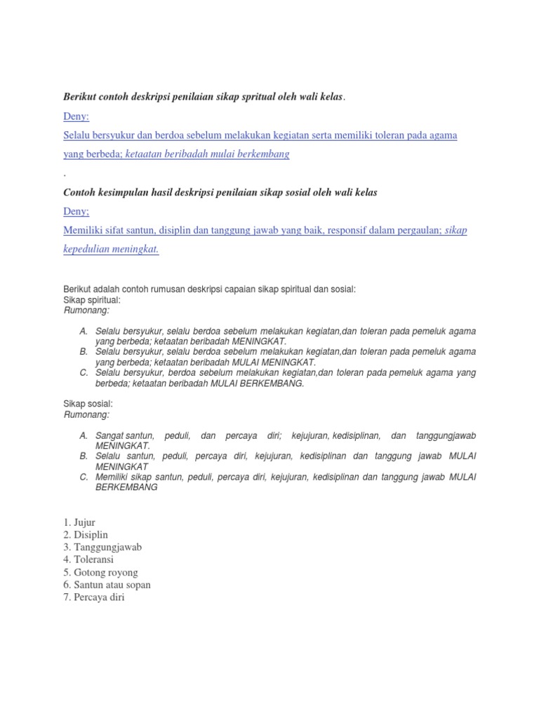 Berikut Contoh Deskripsi Penilaian Sikap Spritual Oleh Wali Kelas