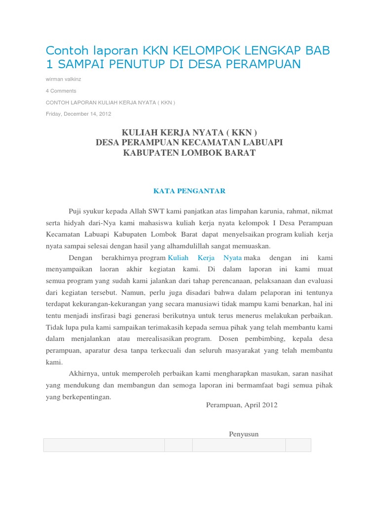 Contoh Laporan Kkn Kelompok Lengkap Bab 1 Sampai Penutup Di Desa Perampuan