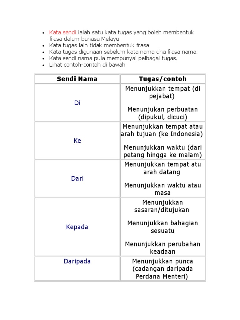 Kata Sendi Ialah Satu Kata Tugas Yang Boleh Membentuk Frasa Dalam Bahasa Melayu