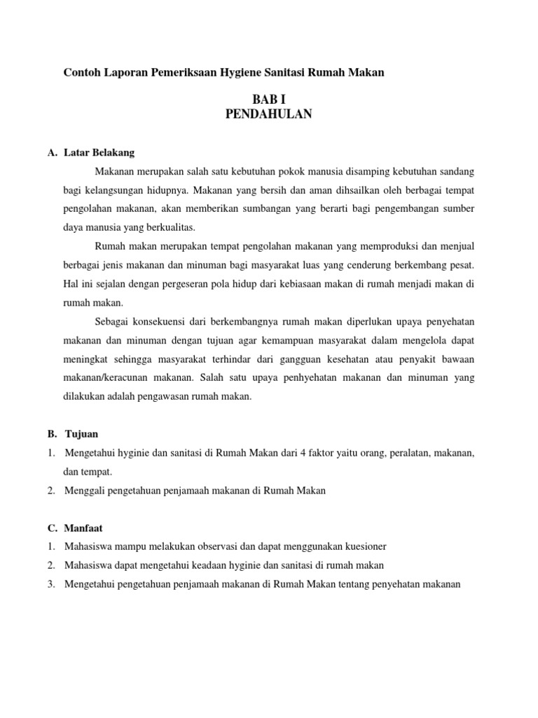 Contoh Laporan Pemeriksaan Hygiene Sanitasi Rumah Makan