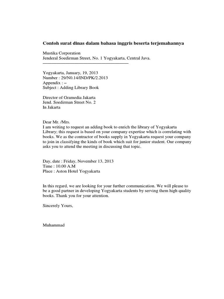 Contoh Surat Dinas Dalam Bahasa Inggris Beserta Terjemahannya