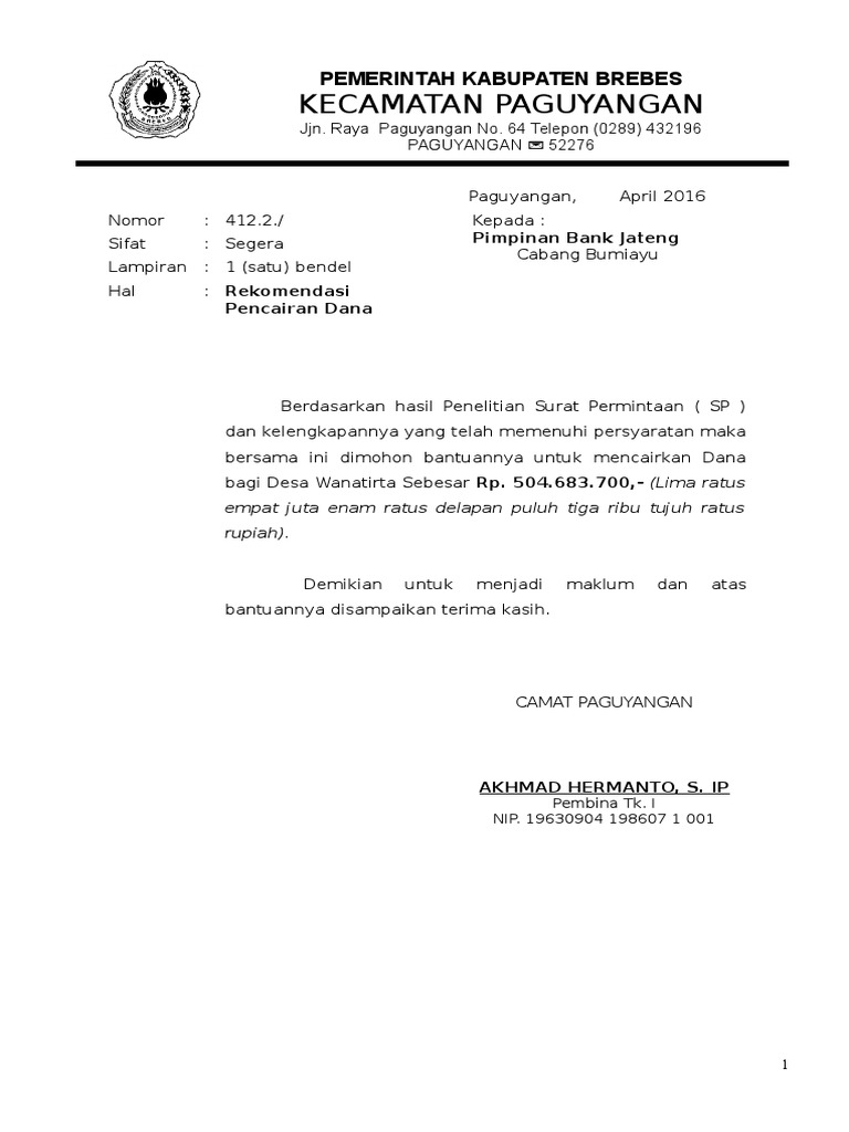 Contoh Surat Permohonan Pencairan Dana Desa - Pasaman 4rt