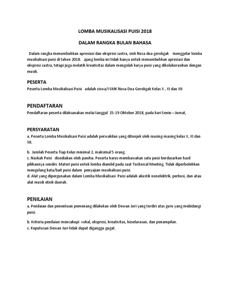 Ketentuan Lomba Musikalisasi Puisi 2018