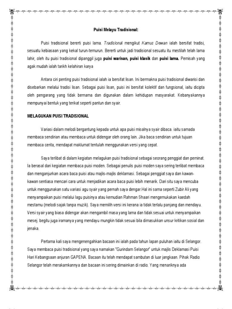 DOC) ANALISA WARISAN PUISI SEBAGAI CERMINAN PEMIKIRAN DINAMIK MASYARAKAT RUMPUN MELAYU TRADISIONAL | Muhammad Afiq Azizan - Academia.edu