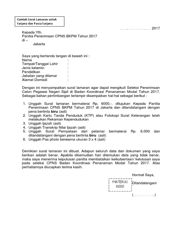 CONTOH SURAT LAMARAN PESERTA CPNS (TULISAN bkd. . surat pernyataan yang ditandatangani di atas materai - [PDF Document]