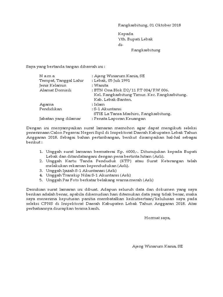 PDF) Contoh surat lamaran CPNS Kab. PALI | hariee as - Academia.edu