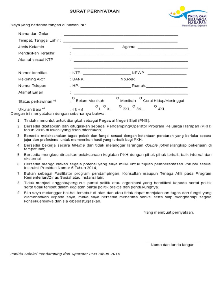 Surat Pernyataan Calon Pendamping Dan Operator PKH