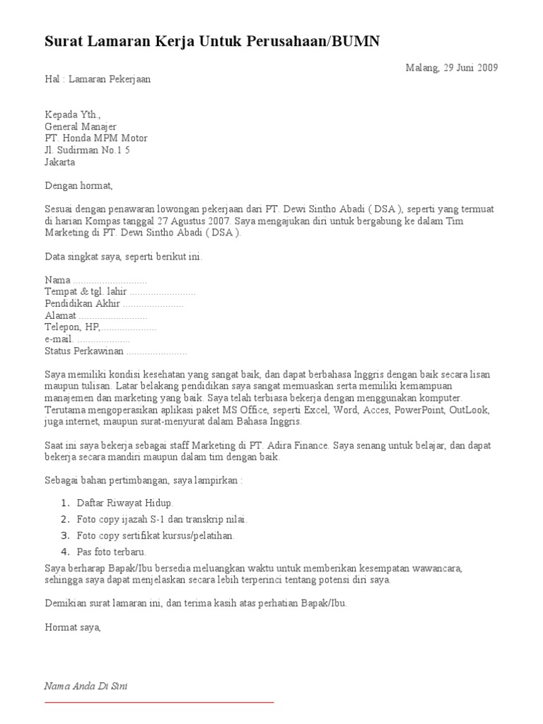 Contoh Surat Lamaran Kerja Dengan Bahasa Indonesia Yang Benar - Bali Job Vacancy
