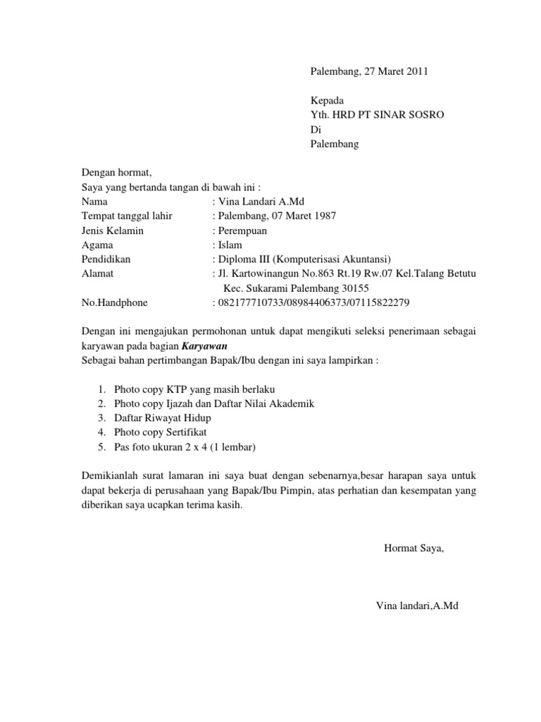 Contoh surat lamaran kerja - Pt Sawita Karya Manunggul Pamukan Estate | Facebook