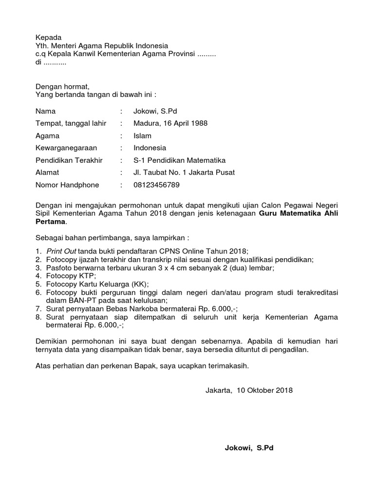 DOC) Contoh Lampiran Surat Lamaran CPNS KEMENAG 2018 | Fathurrauf Ad-Dakhil - Academia.edu