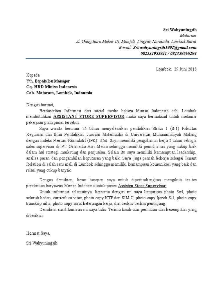 contoh Surat Lamaran Miniso