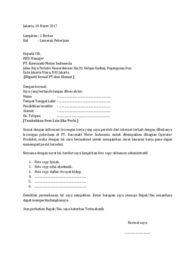 Contoh Surat Lamaran Pt Kawasaki Motor Indonesia – Backup Gambar