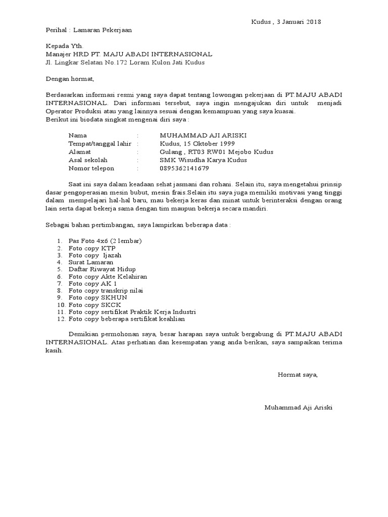 Contoh Surat Lamaran Kerja Operator Produksi 2018