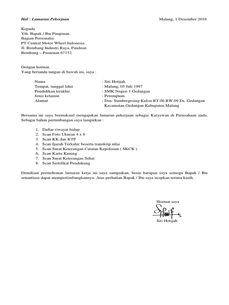 Contoh Surat Lamaran Kerja Di Pt Mitsuba - Contoh Surat Lamaran Kerja