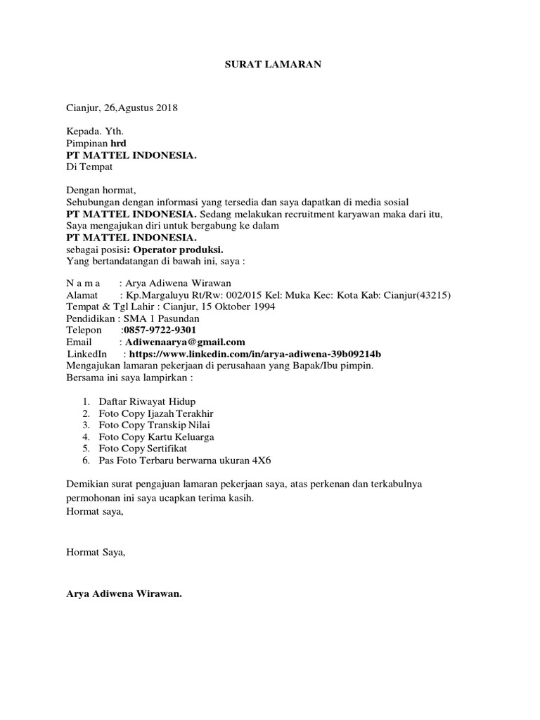 Koleksi gambar terbaru: Surat Lamaran Kerja Operator Produksi