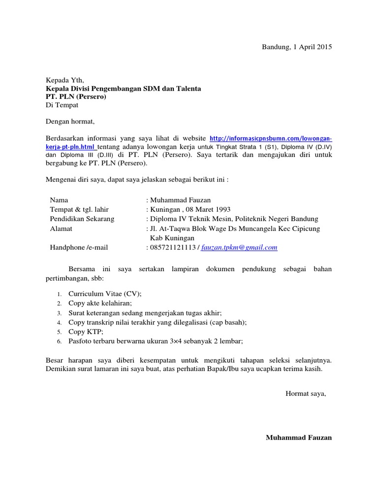 contoh surat lamaran kerja pln pdf Curup