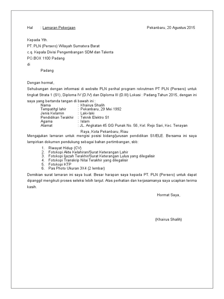DOC) CONTOH SURAT LAMARAN PEKERJAAN PLN | partc padang - Academia.edu