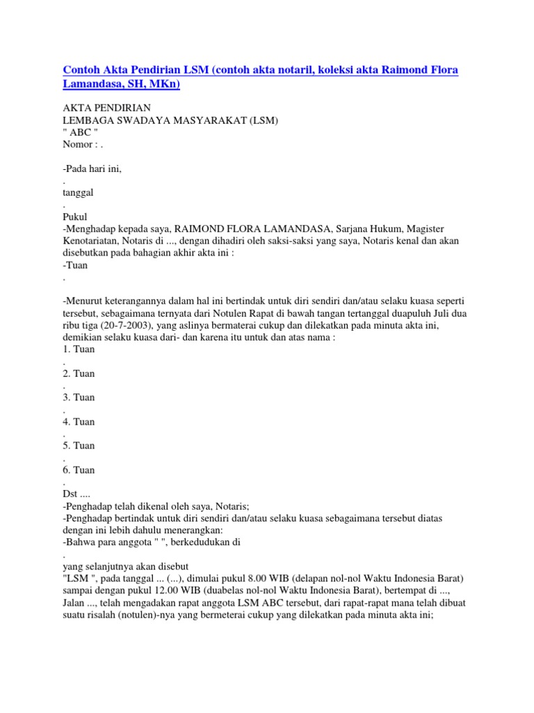 Contoh Surat Pendirian Yayasan - Contoh Perjanjian dan Akta Notaris