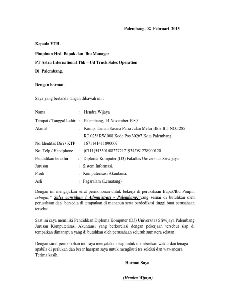 Surat Lamaran PT Astra International Tbk – Ud Truck Sales Operation - Hendra Wijaya Palembang