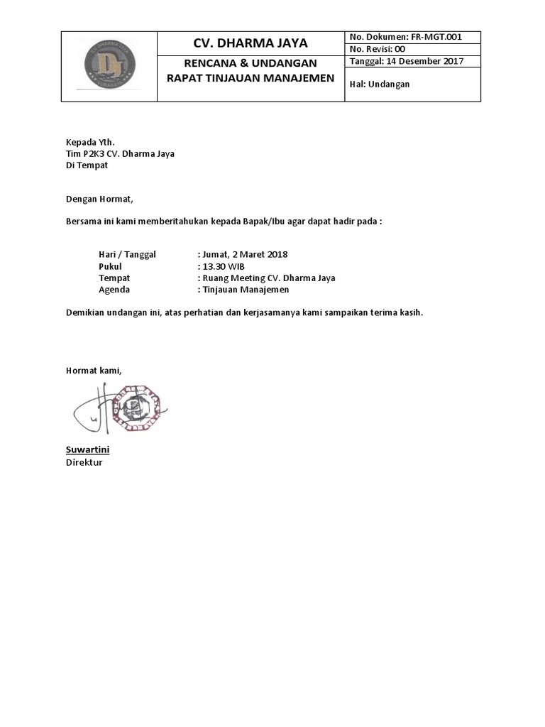 Contoh Surat Undangan Rapat Tinjauan Manajemen