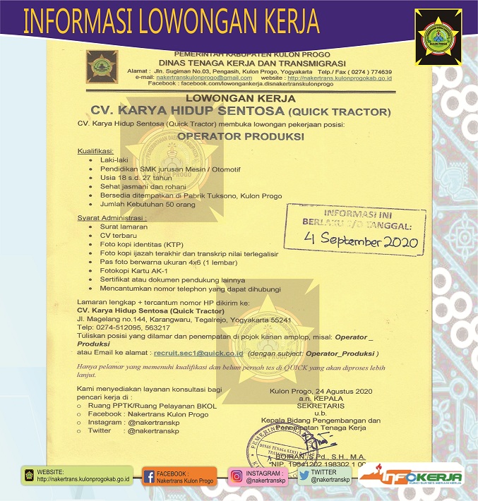 DISNAKERTRANS - LOWONGAN KERJA OPERATOR PRODUKSI CV KARYA HIDUP SENTOSA
