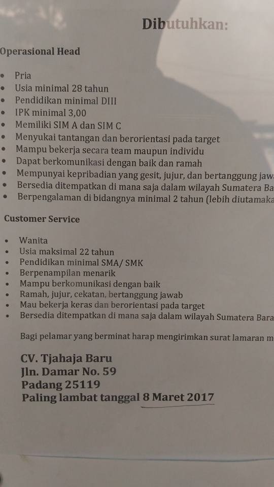 Lowongan Kerja CV. Tjahaja Baru Januari 2020 - LOWONGAN KERJA PADANG DAN SUMBAR