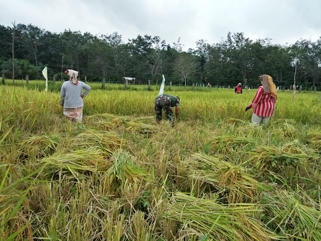 Tingkatkan Ketahanan Pangan, Babinsa Tanjung Tengah Bantu Warga " Matun” Padi Di Sawah